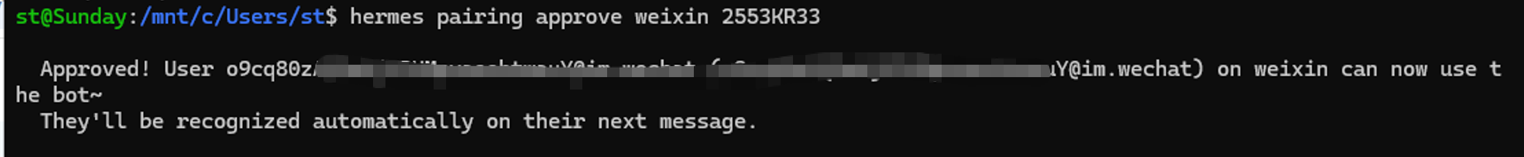在window11上新起一个终端窗口(⚠️要新建一个终端窗口,不然会报 hermer 不是命令),进入 wsl ,输入配对