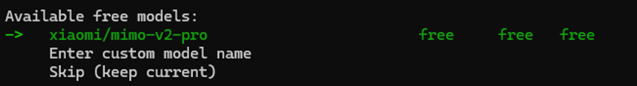 选择大模型提供商,这里选择第一个,也就是 Hermes 的开发团队,因为选择这个可以免费使用小米的 mimo-v2-pro 大模型(需要到官网注册https://portal.nousresearch.com/,且需要绑定外币卡 0刀即可)