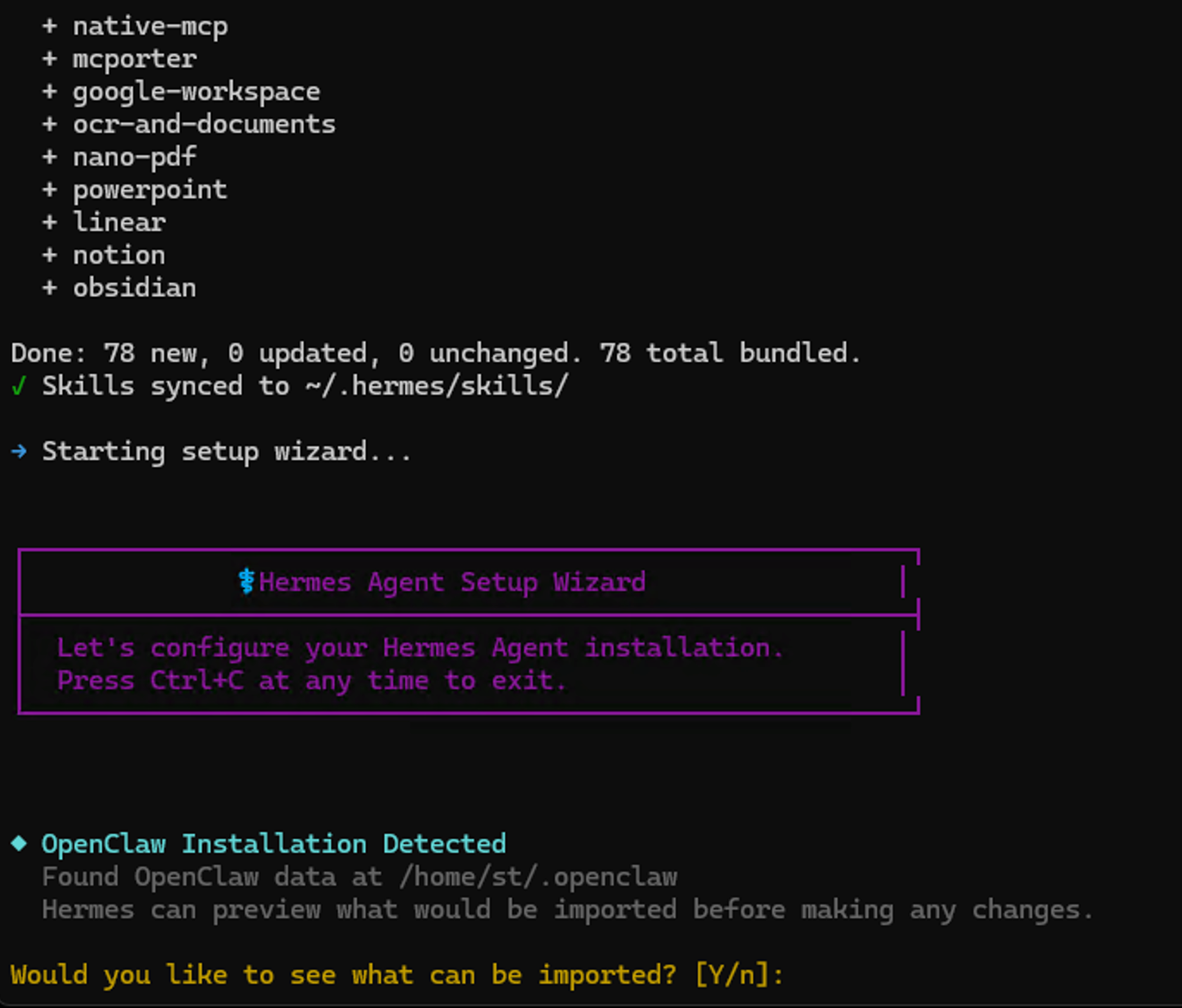 有趣的是,居然会检测到我安装的龙虾 openclaw 配置,会问你是否导入 且迁移 OpenClaw 的配置到 Harmes,选择是的话,会出现下图